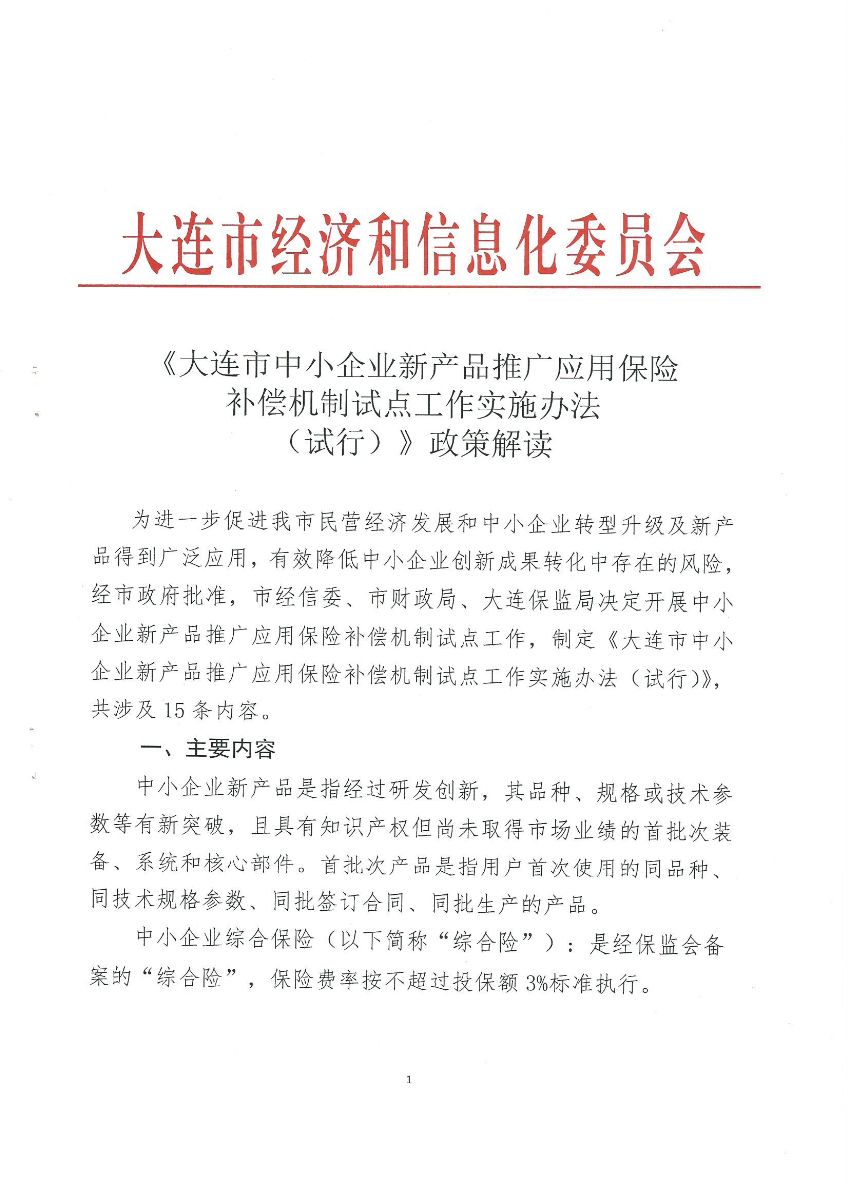 《大连市中小企业新产品推广应用保险补偿机制试点工作实施办法(试行)》政策解?